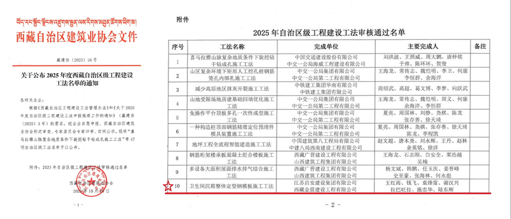 10月10日,西藏自治区建筑业协会发布2025年度西藏自治区工程建设省级工法名单,集团公司申报的《卫生间沉箱整体定型钢模板施工工法》喜登榜单。